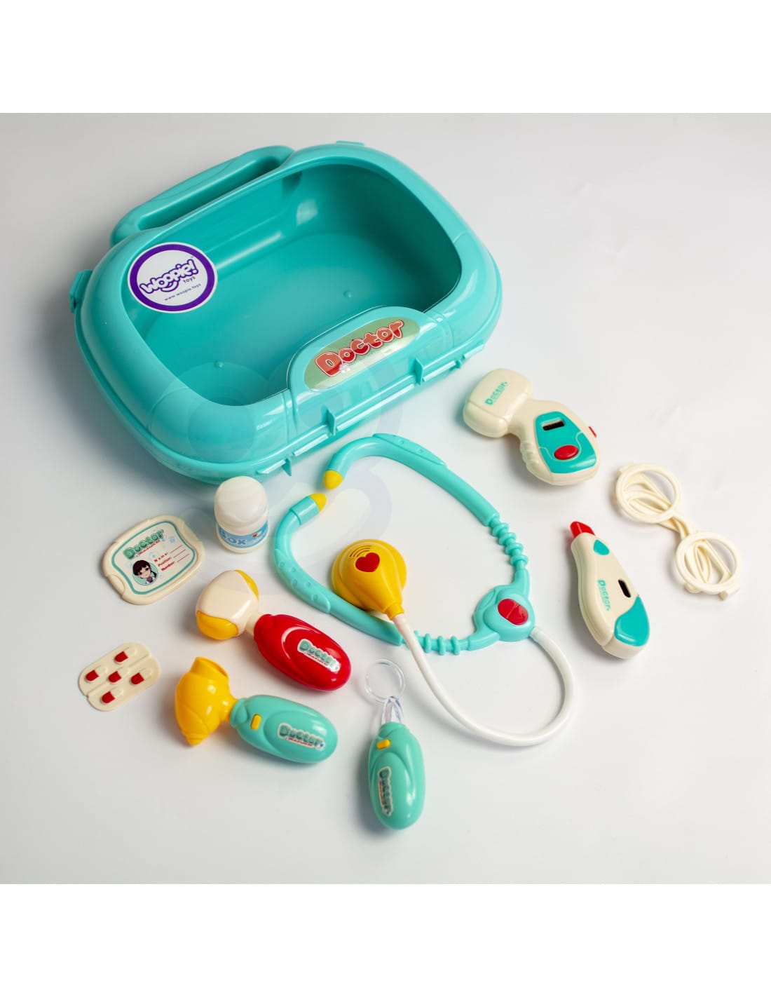 WOOPIE komplet malega zdravnika je sanjska igrača za otroke, ki jih zanima medicina. Komplet omogoča realistično igro vlog z naprednimi funkcijami medicinskih pripomočkov. Stetoskop je opremljen z utripajočo lučko in zvokom srčnega utripa, termometer prikazuje različne temperature (nastavljive z gumbom) in ima osvetljen zaslon pa meri tlak z osvetljenim prikazovalnikom rezultatov. Otoskop in ogledalo prav tako vključujeta svetlobne učinke.