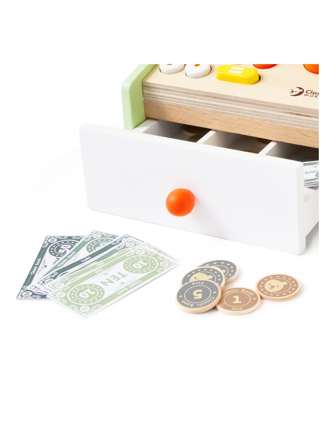 Classic World lesena blagajna je odličen dodatek za otroke, ki radi igrajo vloge in se učijo skozi igro. Zasnovana z mislijo na detajle, blagajna vključuje vse, kar potrebujete za simulacijo trgovine: bankovce, kovance, plačilno kartico, skener, števec, zaslon in predalček za denar.