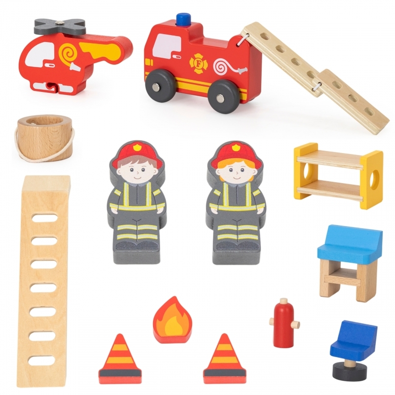 Komplet vsebuje trietažno leseno gasilsko postajo, gasilski tovornjak, gasilski helikopter z rezervoarjem za vodo, dve figurici gasilcev, element plamena, gasilni aparat, dva prometna stožca ter pohištvo za notranjost remize.