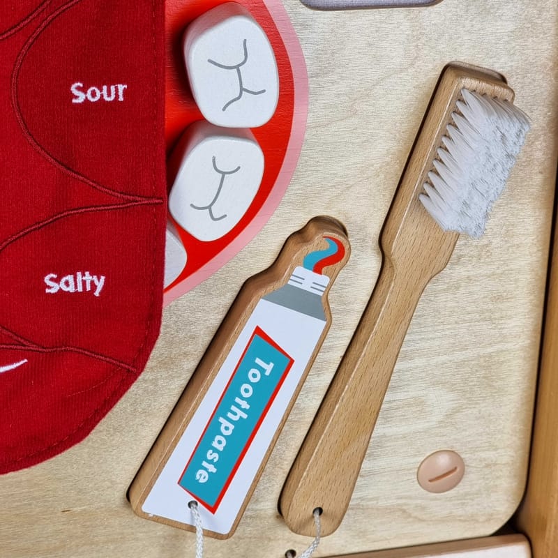 Tabla vsebuje lesene elemente na vrvici – zobno ščetko, zobno pasto in zobno nitko – s katerimi otroci vadijo pravilno ščetkanje zob in uporabo nitke. Na tabli je prikazan tudi jezik s področji za različne okuse (sladko, kislo, grenko, slano), kjer morajo otroci s pomočjo velcro trakov razvrstiti hrano k ustreznemu okusu.