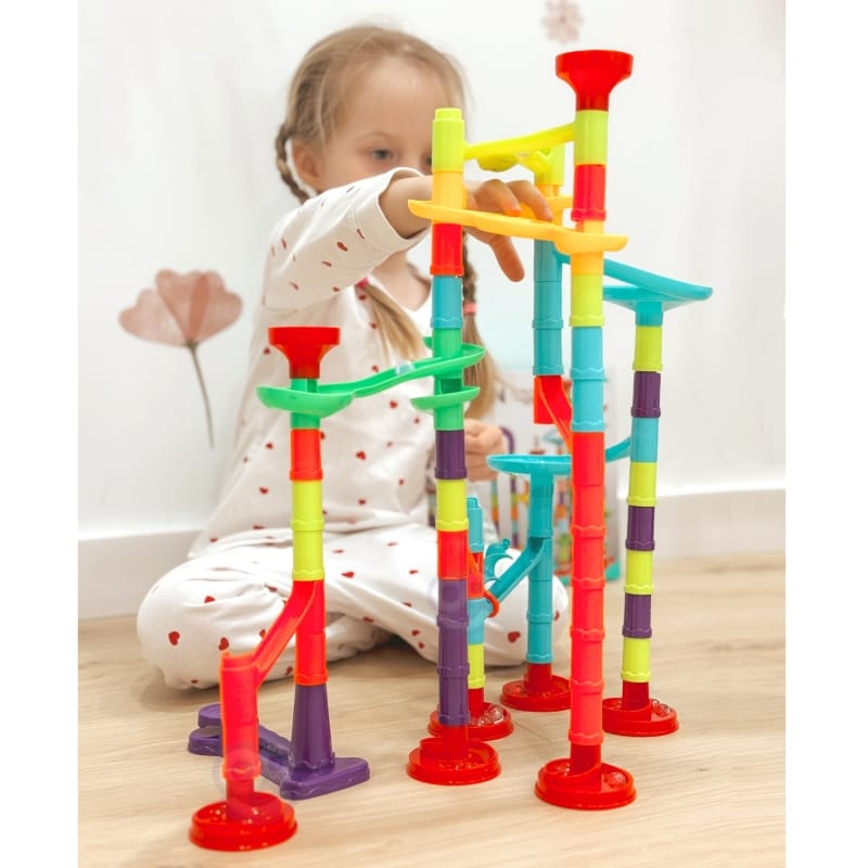 Marmorna cevna steza WOOPIE je interaktivni konstrukcijski komplet, ki otrokom omogoča sestavljanje različnih prosto tekočih stez za kroglice. Z 113 elementi, vključno z izstreljevalnikom, spodbuja kreativnost, logično razmišljanje in koordinacijo rok in oči. Celoten opis ↓