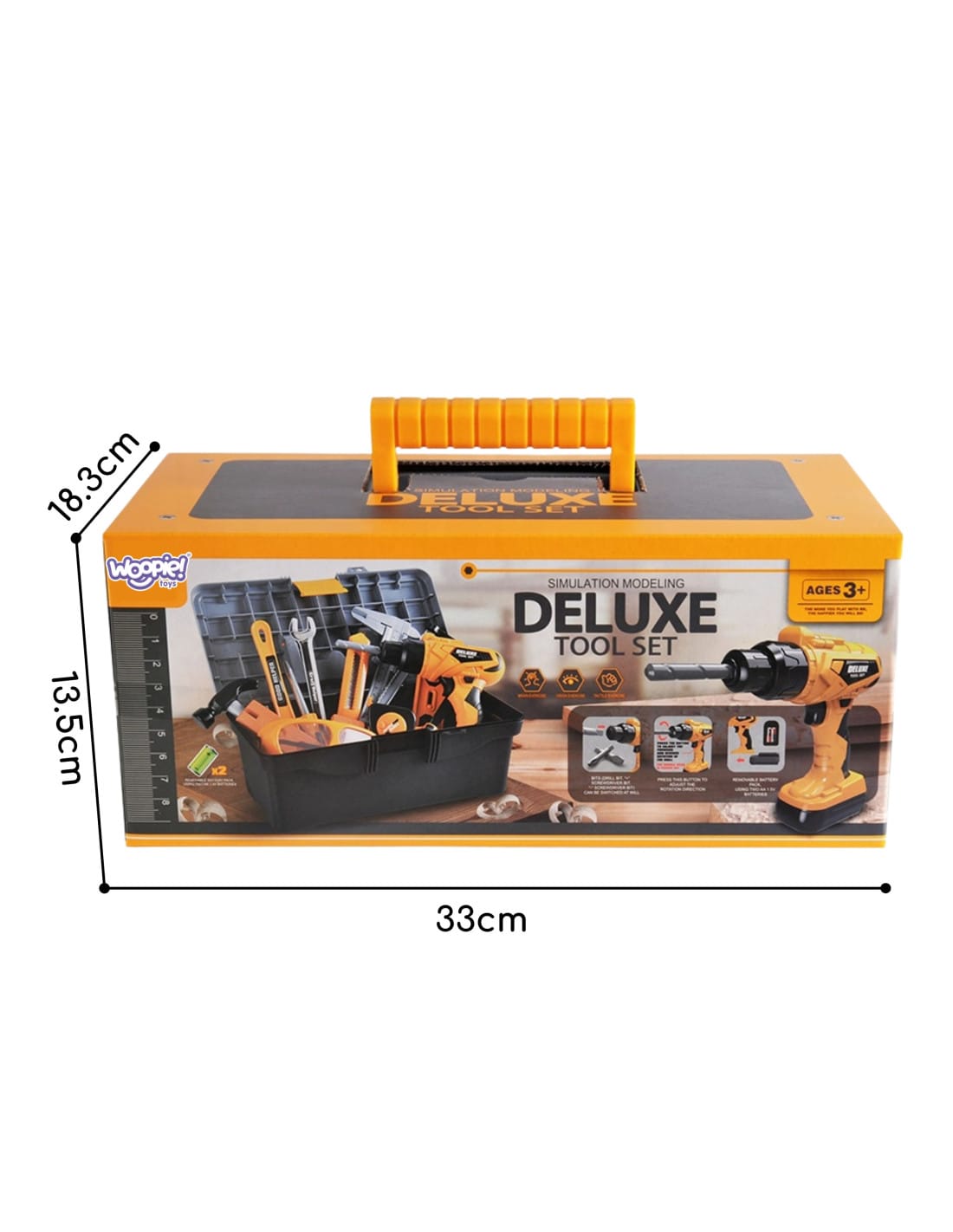 WOOPIE otroški kovček z orodjem je sanjski komplet za vse otroke, ki radi posnemajo odrasle pri gradnji, popravilih in ustvarjanju. V priročnem kovčku se skriva kar 39 delov: električni vrtalnik z nastavki, zaščitna očala in maska, vijaki, matice, ploščice ter osnovna orodja.