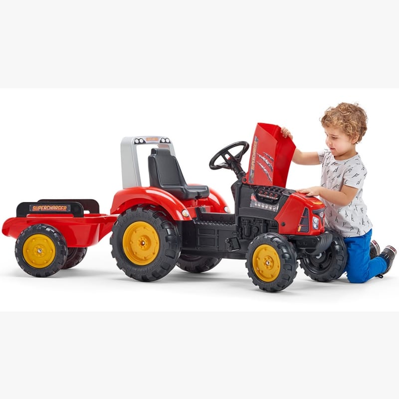 Traktor na pedala Red Supercharger znamke FALK je popolna izbira za male ljubitelje velikih strojev. Zasnovan je za otroke od 3. leta starosti, z vzdržljivo konstrukcijo in nosilnostjo do 50 kg, kar omogoča večletno uporabo. Opremljen je s snemljivo prikolico, ki omogoča prevoz igrač, materiala ali domišljijskih “pridelkov”, ter volanom s klaksonom za realistično doživetje. Odprta maska motorja razkriva imitacijo pravih motornih delov – prava paša za oči za vse male mehanike! Traktor ima verižni pogon na zadnjo os, vrtljivo sprednjo os za lažje krmiljenje in kolesa iz kakovostne plastike, primerna za različne terene. Delno sestavljen izdelek omogoča enostavno montažo.