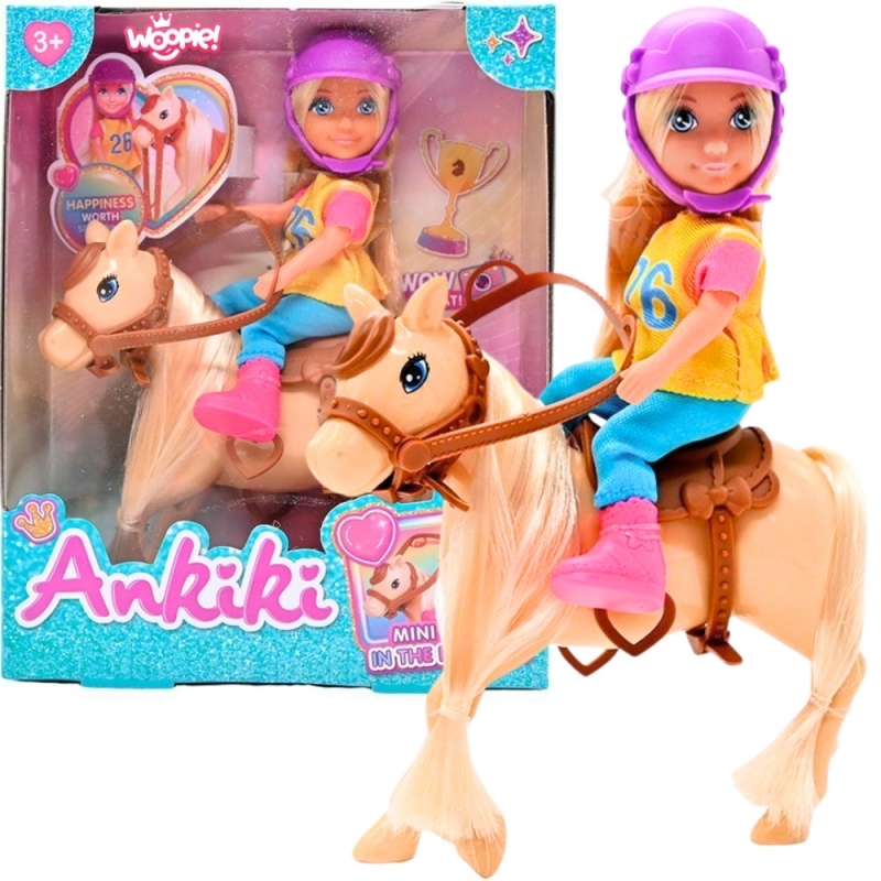 Punčka jahačica s konjem Woopie Royal je čudovit igralni komplet za vse otroke, ki obožujejo konje, šport in igro vlog. Punčka, oblečena v jahalno opravo s čelado, je pripravljena na treninge in tekmovanja, njen zvesti konj pa jo spremlja pri vsaki pustolovščini. Ta komplet spodbuja domišljijsko igro in otroku omogoča, da se vživi v svet jahanja in skrbi za živali.