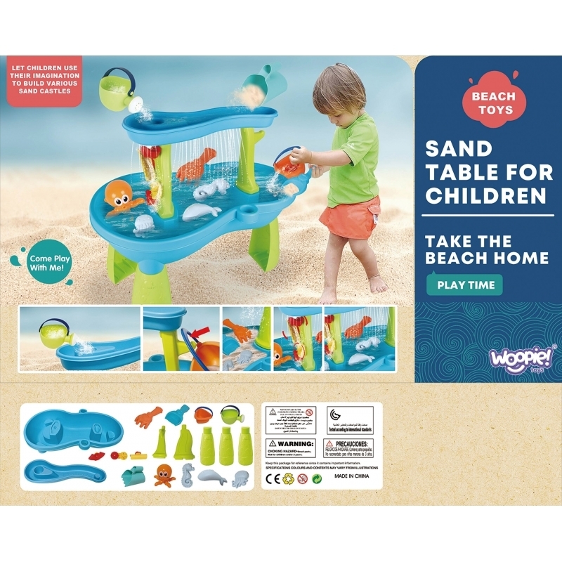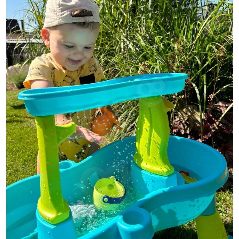 WOOPIE Vodna miza Hobotnica je popoln izdelek za zabavno igro z vodo in peskom! Otroci lahko nalivajo vodo v zgornji del mize, kjer ustvarijo vodni slap ali dež, ki teče skozi luknjice in vrti vodna kolesa. Komplet vključuje kar 18 dodatkov, vključno s simpatično hobotnico, oblikami za pesek, zalivalko, košarico in lopatkami. Primerna je za igro doma ali na prostem. Celoten opis ↓