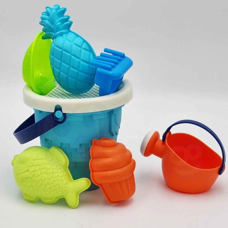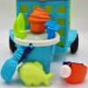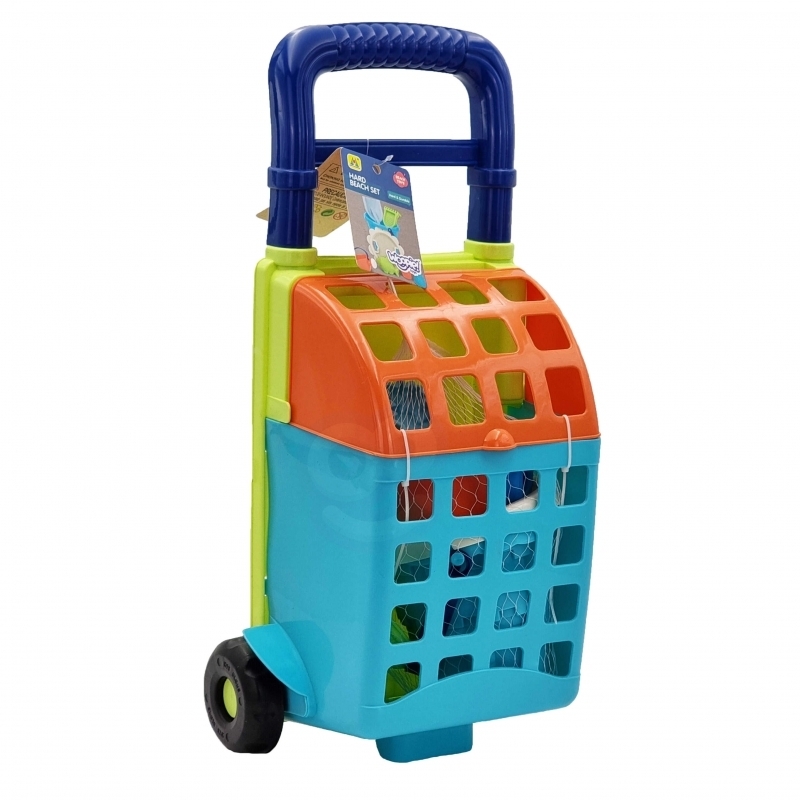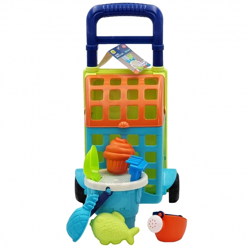 - Vsebina kompleta: Voziček, vedro, sito, kanglica, tri modelčki, lopatka, grablje