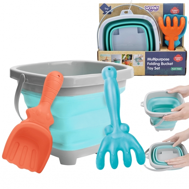 WOOPIE Zložljivo silikonsko vedro z grabljicami in lopatko v modri barvi je praktična in zabavna igrača za igro na prostem. Kompaktna zasnova omogoča, da se vedro zloži na višino le 4 cm, kar olajša prenašanje in shranjevanje v nahrbtniku, vozičku ali torbi. Ko je raztegnjeno, ima vedro kapaciteto 5 litrov, kar je idealno za gradnjo gradov iz peska ali igro z vodo.